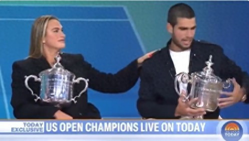 两位冠军全部插足节目,萨巴伦卡误把阿尔卡拉斯叫成了辛纳。