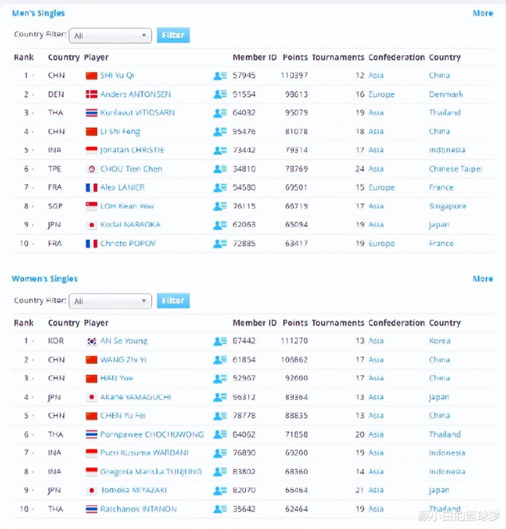 陈雨菲的宇宙名次照旧第五莫得任何变化,她的前边是山口茜、韩悦、王祉怡、安洗莹。