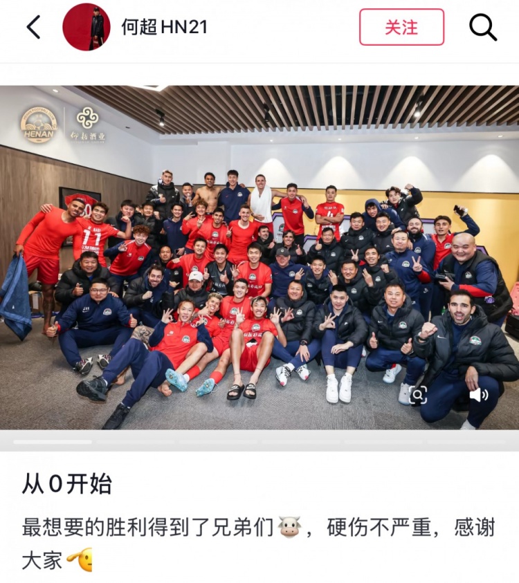 赛后为河南队首发的何超更新社媒,晒出全队赛后在更衣室庆祝的相片和比赛照等体育集锦,并配文写谈:“从0启动。最念念要的顺利得回了,兄弟们,硬伤不严重,感谢宇宙。”
