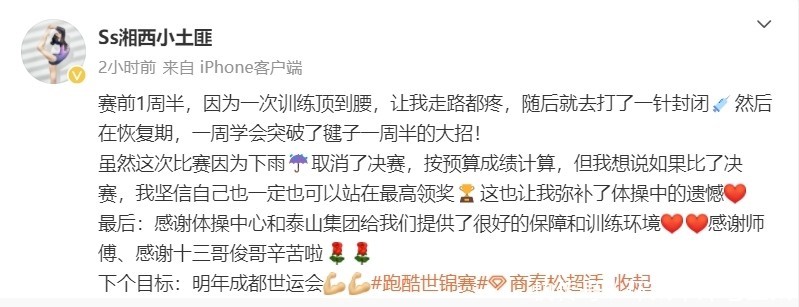 在夺冠后,商春松在支吾媒体发声。她露馅在比赛前一周半的时候,磨真金不怕火中顶到了腰部,以至于走路王人疼。为了参赛,商春松不得不打禁闭坚抓。也即是在收复期,商春松因祸得福,她一周本领学会摧毁了毽子一周半的大招,这也匡助她一举夺魁。关于下雨取消的决赛,商春松很有信心肠暗示,就算比了决赛,她也有信心站上最高领奖台,这枚世锦赛金牌弥补了她在体操的缺憾。