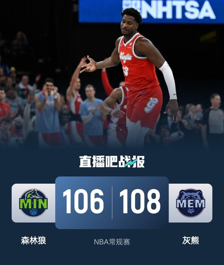 比赛启动,丛林狼很慢热4分钟内一分未得,灰熊7-0跳跃,麦克丹尼尔斯扣篮止血,里德里突外投聚拢取分,灰熊瞬停止电,爱德华兹接连三分首节反超7分,次节两边射中率都有下落但依然伸开拉锯战,爱德华兹联手里德助队拉开双位数跳跃,莫兰特和贝恩止血,半场丛林狼跳跃11分。下半场,两边连接拉锯战,后半段丛林狼伏击端受阻,灰熊替补全民齐兵聚拢追分,三节灰熊悼念差5分,小节灰熊一度悼念差1分,迪林厄姆成为奇兵,里突外投连砍7分联赛里德助队稳住方位,但小贾伦-杰克逊接连膺惩内线得分上双还能助队咬住比分,随后灰熊接连罚球11-0反超比分,里德连得5分止血,爱德华兹绝杀三分不中,最终灰熊108-106逆转丛林狼。
